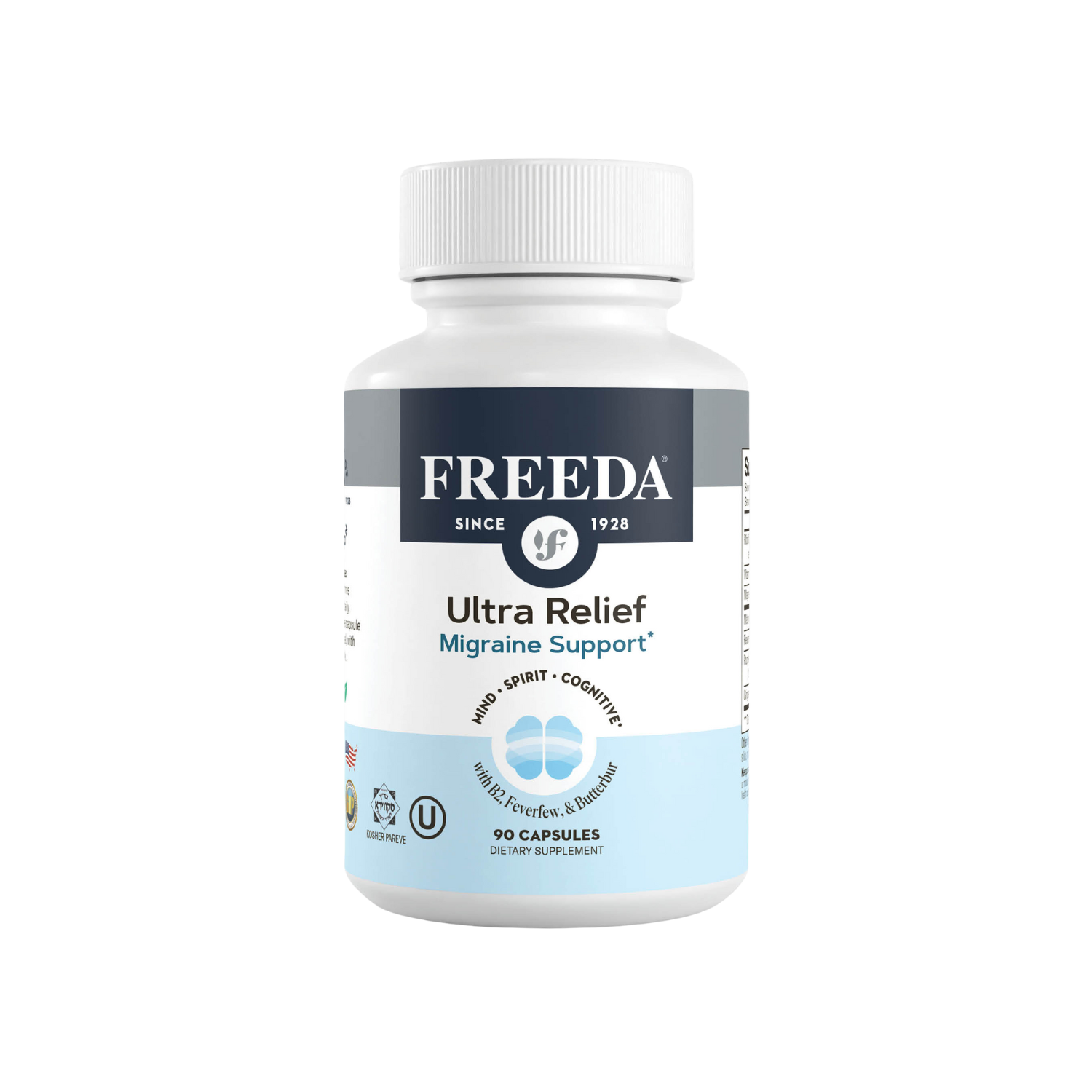 Freeda Ultra Relief delivers migraine and headache support when you need it most. Expertly formulated for migraine sufferers with a unique blend of highly researched ingredients including herbal Feverfew, Purple PA-Free Butterbur Root Extract, and Ginger Root Extract along with other tension-relieving vitamins and minerals. Ultra Relief supports head comfort and relaxation: use it as a long-term nutritional support to help alleviate migraines and tension headaches.*