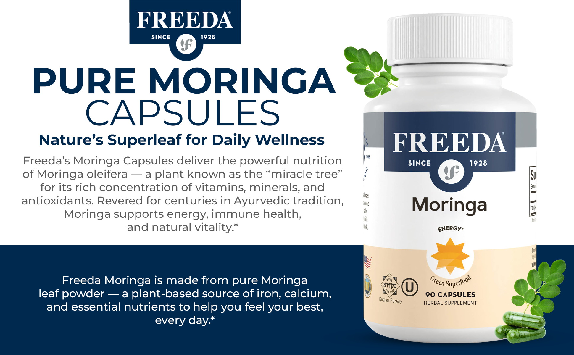 Discover the power of moringa, a nutrient-packed “green superfood” used for centuries in traditional wellness practices across Asia and Africa. Freeda’s Moringa delivers 1000 mg of pure, organic moringa leaf powder per serving in vegan capsules, free of fillers, sugars, or artificial ingredients.