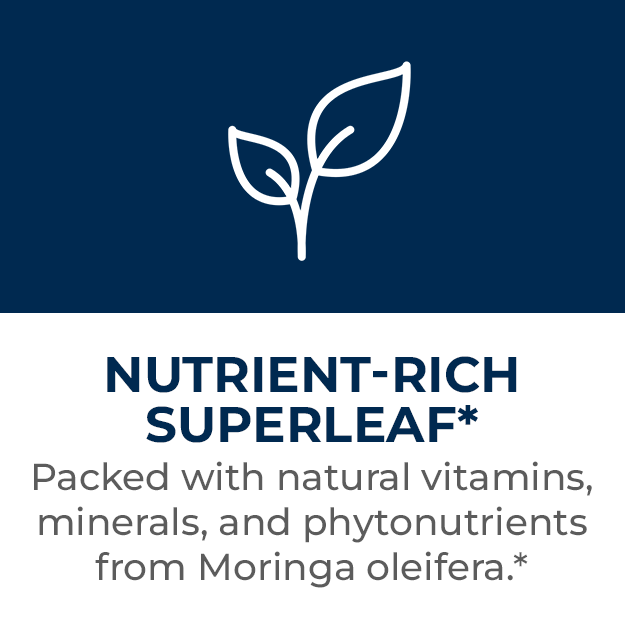 Rich in vitamins A and C, calcium, iron, and antioxidants like quercetin, moringa may support antioxidant defense, healthy inflammation response, and metabolic wellness, as explored in studies like a 2014 review in Frontiers in Pharmacology.*