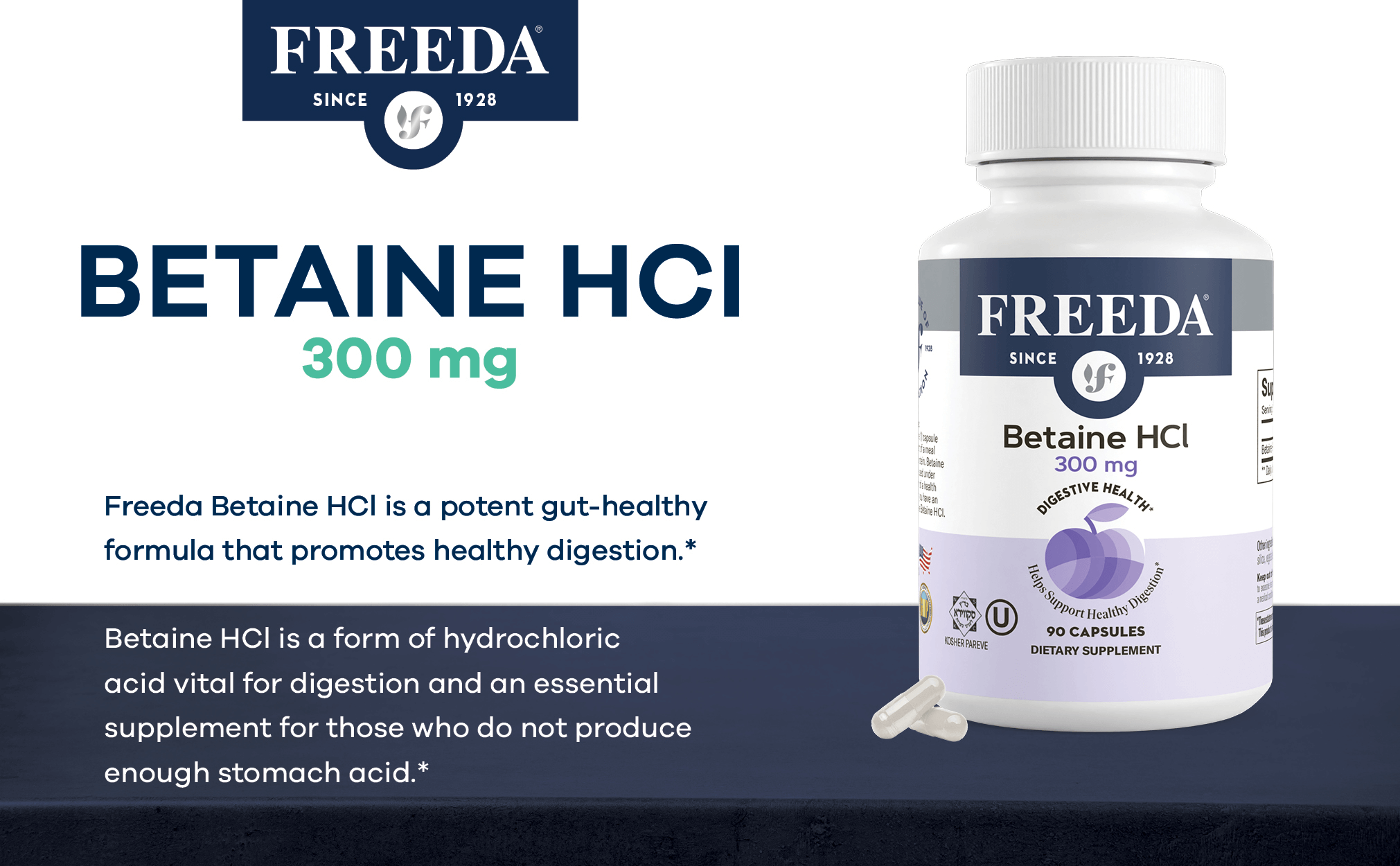 - PURE BETAINE HCL - Freeda Betaine HCl is a potent gut-healthy formula that promotes healthy digestion. Betaine HCl is a form of hydrochloric acid (stomach acid) vital for digestion and an essential supplement for those who do not produce enough stomach acid. *