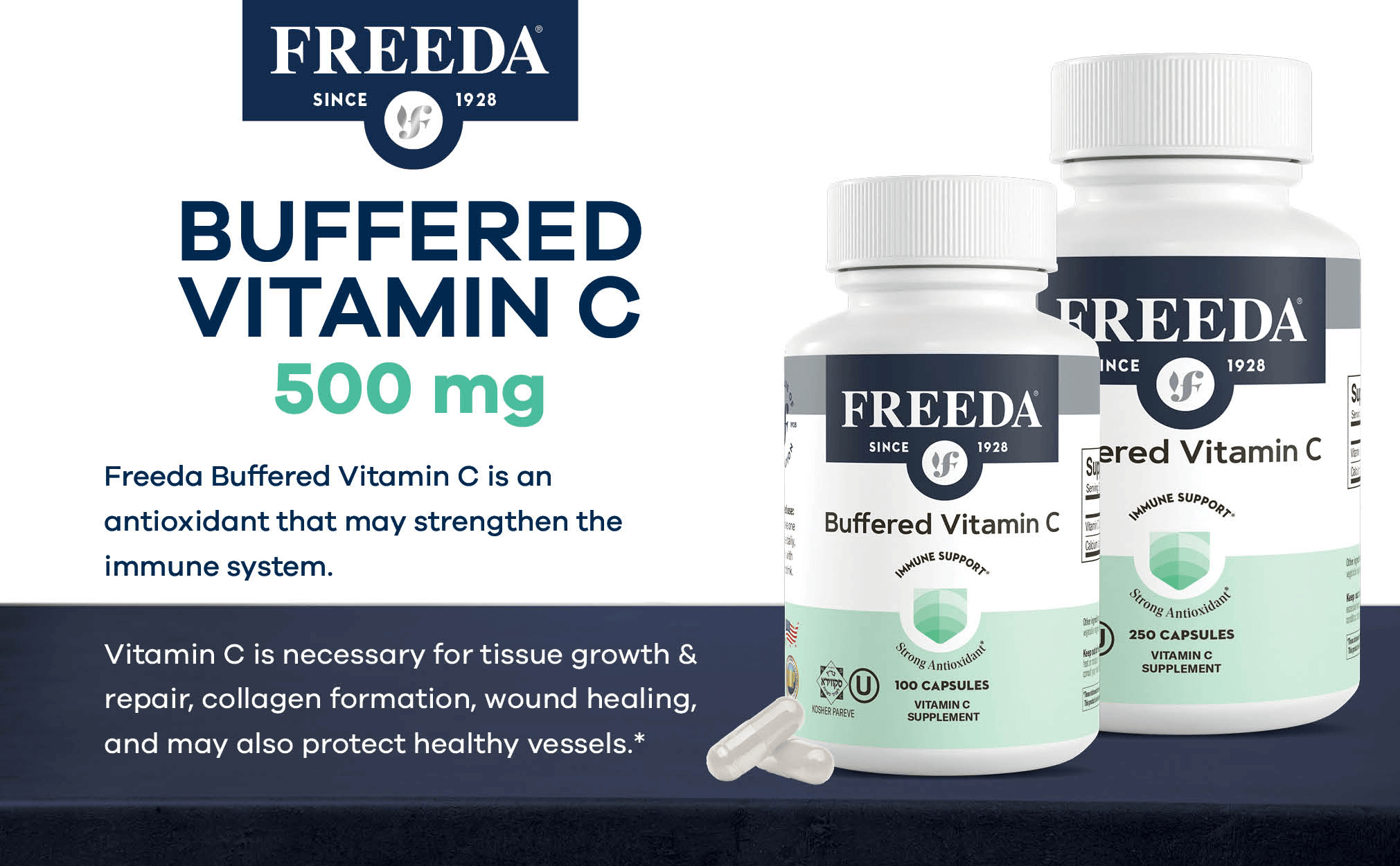 - BUFFERED VITAMIN C 500MG - Vitamin C 500 mg dosage from calcium ascorbate. Freeda buffered Vitamin C capsules contain a small amount of calcium. Advisable for sensitive stomachs as an alternative to pure Vitamin C tablets, Vitamin C pills, or Vitamin C softgels.
