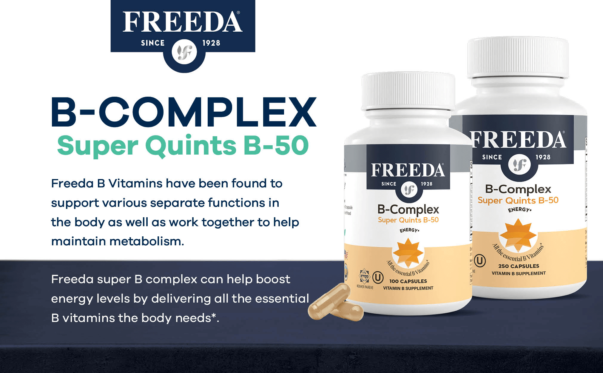 B complex super quints give me the energy I need throughout the day. Freeda Vitamins are the only brand I buy and trust since @ 1995.