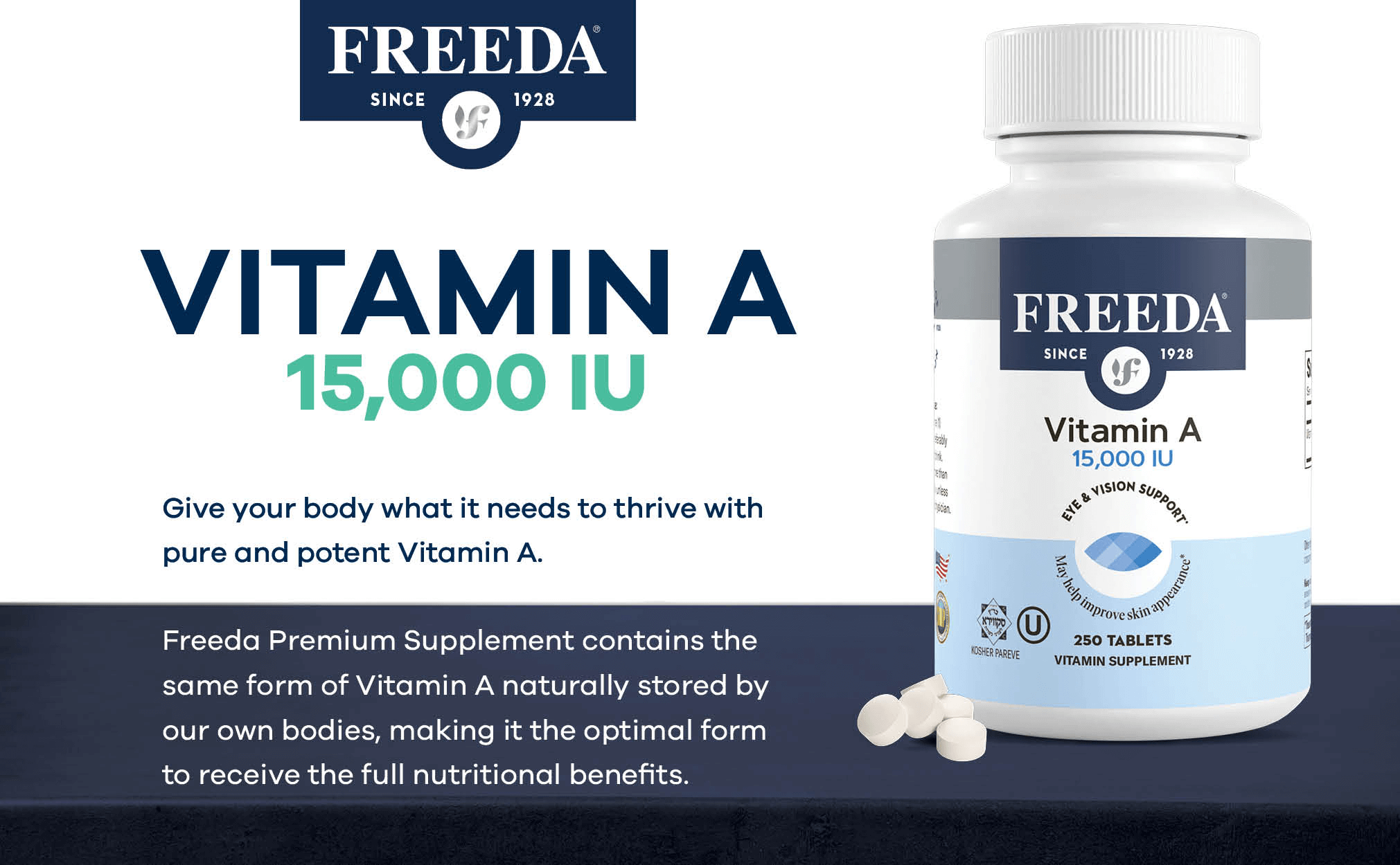 - 15,000 IU VITAMIN A - Our Vitamin A supplement is used to prevent or treat low levels of this essential vitamin in people who do not get enough of it from their diets. The palmitate form of Vitamin A is most easily absorbed by the body.