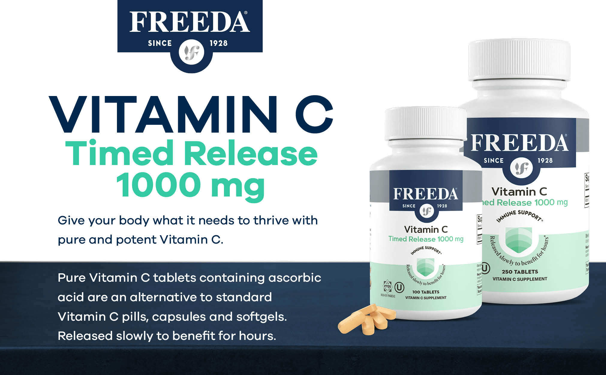 - TIMED RELEASE VITAMIN C- This product is formulated to release slowly into the body over the span of many hours. Regular Vitamin C is water soluble and does not stay in the body for an extended period of time. That is why Freeda has formulated this Timed Release Vitamin C that releases slowly and benefits the body for many hours*.