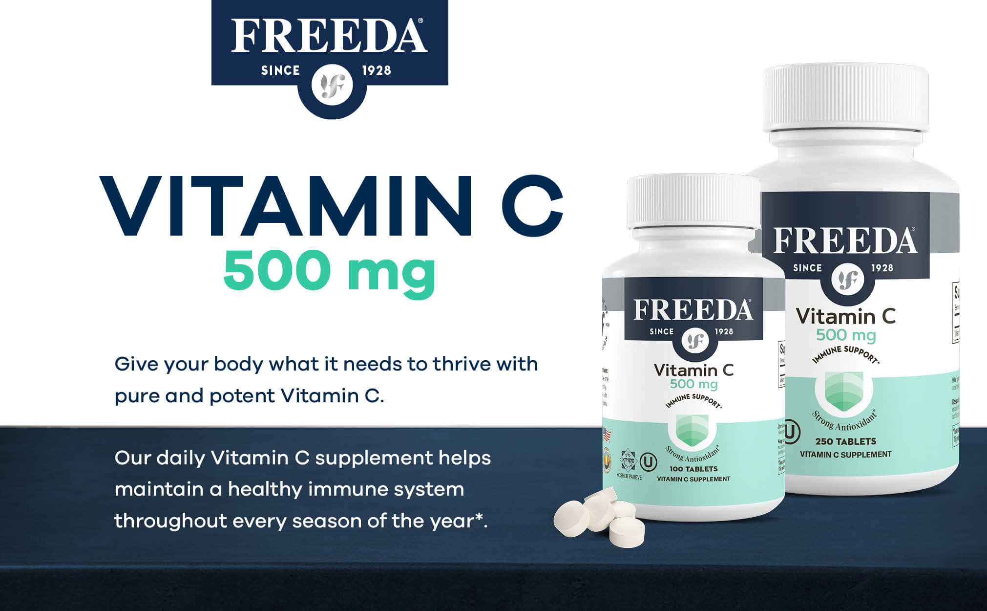• PURE VITAMIN C 500MG - Vitamin C 500 mg dosage. Freeda Vitamin C tablets as ascorbic acid are an easy to swallow alternative to Vitamin C pills, Vitamin C capsules, or Vitamin C softgels. May improve absorption of Iron when taken at the same time.