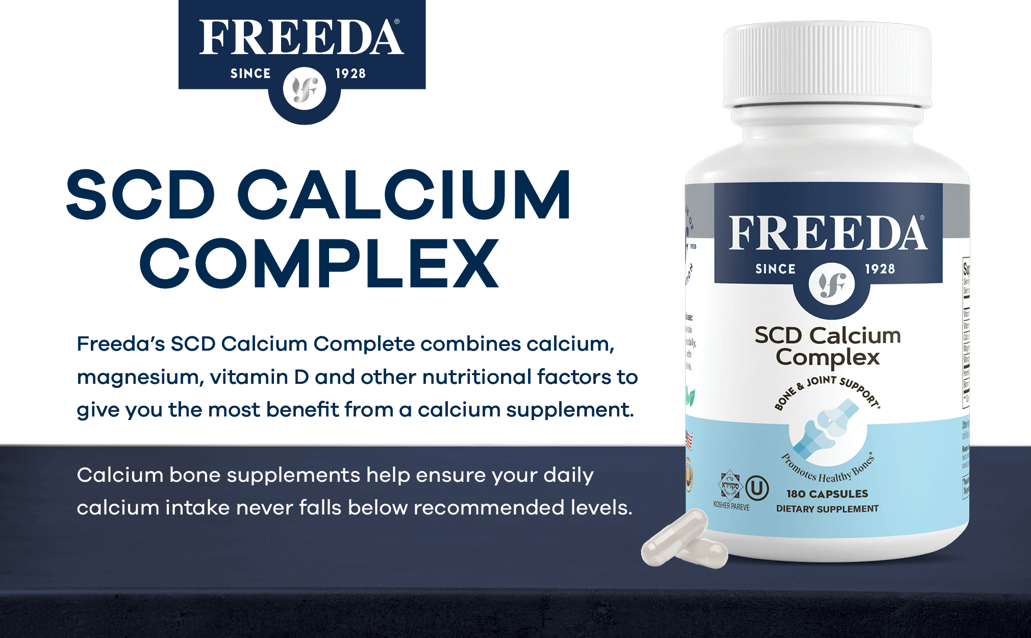 - BONE HEALTH & JOINT SUPPORT - Freeda's SCD Calcium Complete combines calcium, magnesium, vitamin D and other nutritional factors to give you the most benefit from a calcium supplement. Prevent low calcium levels with Freeda calcium supplements for women and men. Calcium for women and men bone supplements help ensure your daily calcium intake never falls below recommended levels.