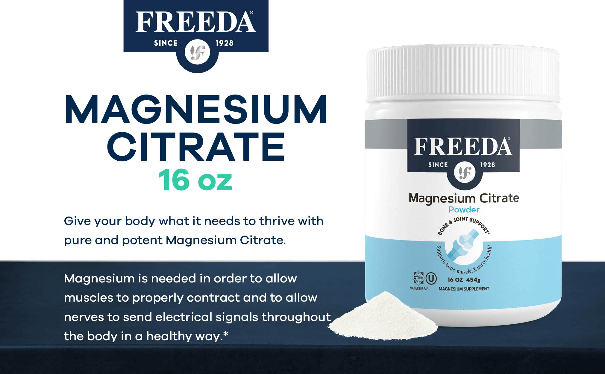 - MAGNESIUM CITRATE POWDER - Pure magnesium citrate powder. Freeda Magnesium Citrate Powder is available as an alternative to magnesium citrate capsules, magnesium citrate tablets, or standard magnesium gel capsules. Mix with food or drink.