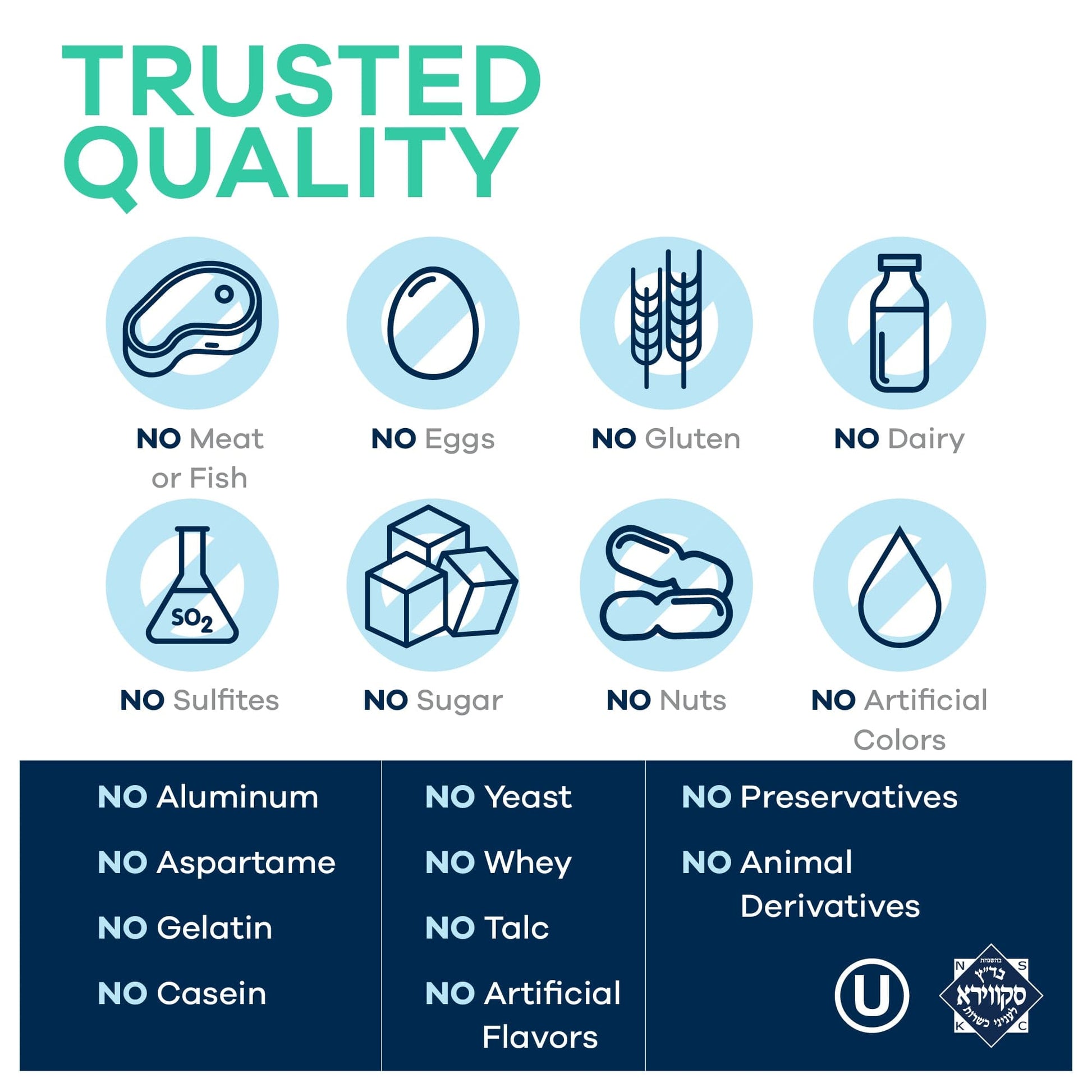 • Clean & Kosher Formula – Vegan and kosher certified, free of gelatin, sugar, artificial colors/flavors, lactose, and animal derivatives.
